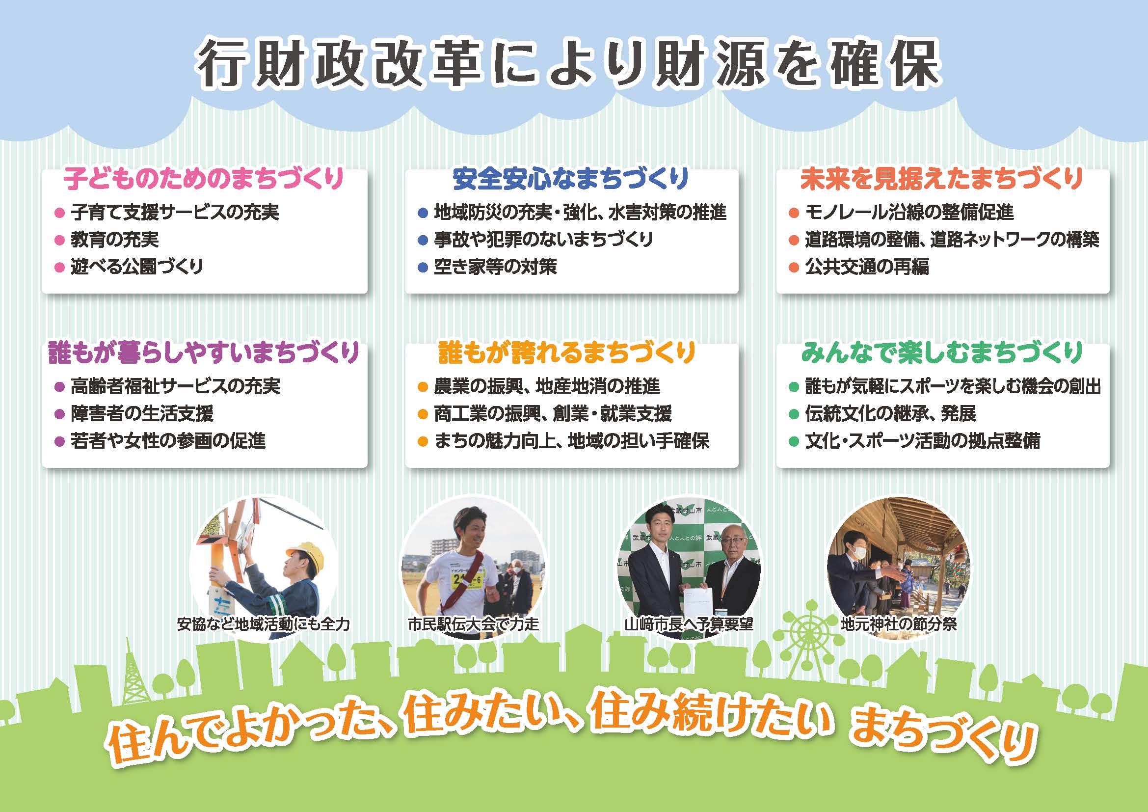 地元・武蔵村山市のために働きたいと市役所に入庁して約12年。仕事を通じて地域の様々な方と関わり、話をする中で行政課題について考えさせられました。消防団、交通安全協会などの地域活動を通じて、市民一人ひとりの力の重要性、地域への愛着の大切さを学びました。 自分が育ったまちを、みんなにもっと好きになってもらいたい。子どもや若い人には、ずっと武蔵村山に住み続けてもらいたい。そのためには、今までこのまちを守り育ててきた世代との融合が必要であり、地域を継承・発展させていかなければなりません。 安定した市役所での生活を捨て、武蔵村山市にすべてを捧げる思いで一念発起。若さと行動力で地域を元気に!持ち前の行動力と思いやりと熱い情熱で、武蔵村山市に新たな風を吹き込むべく、高い志と強い武蔵村山愛を持って、市政に向き合ってまいります。